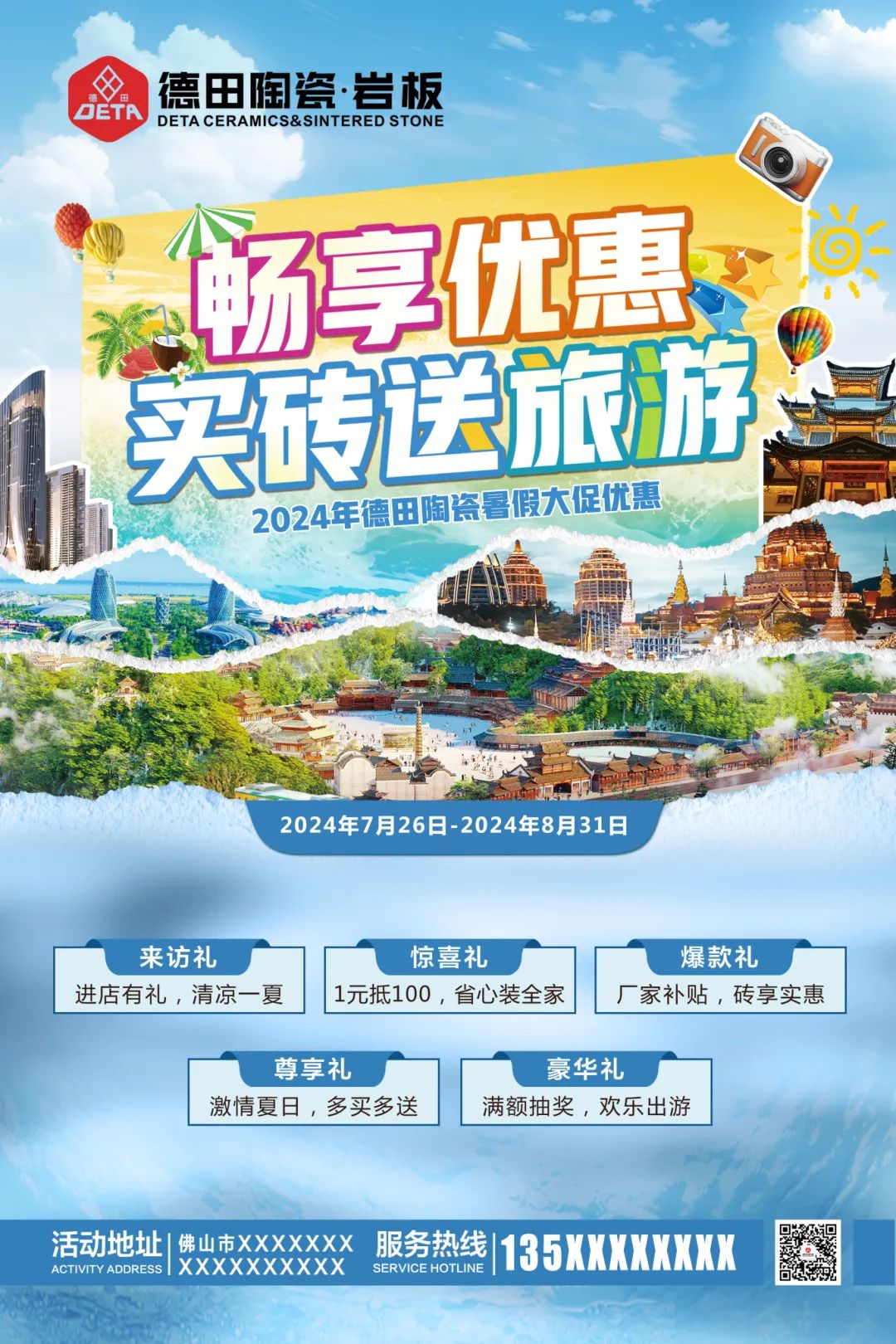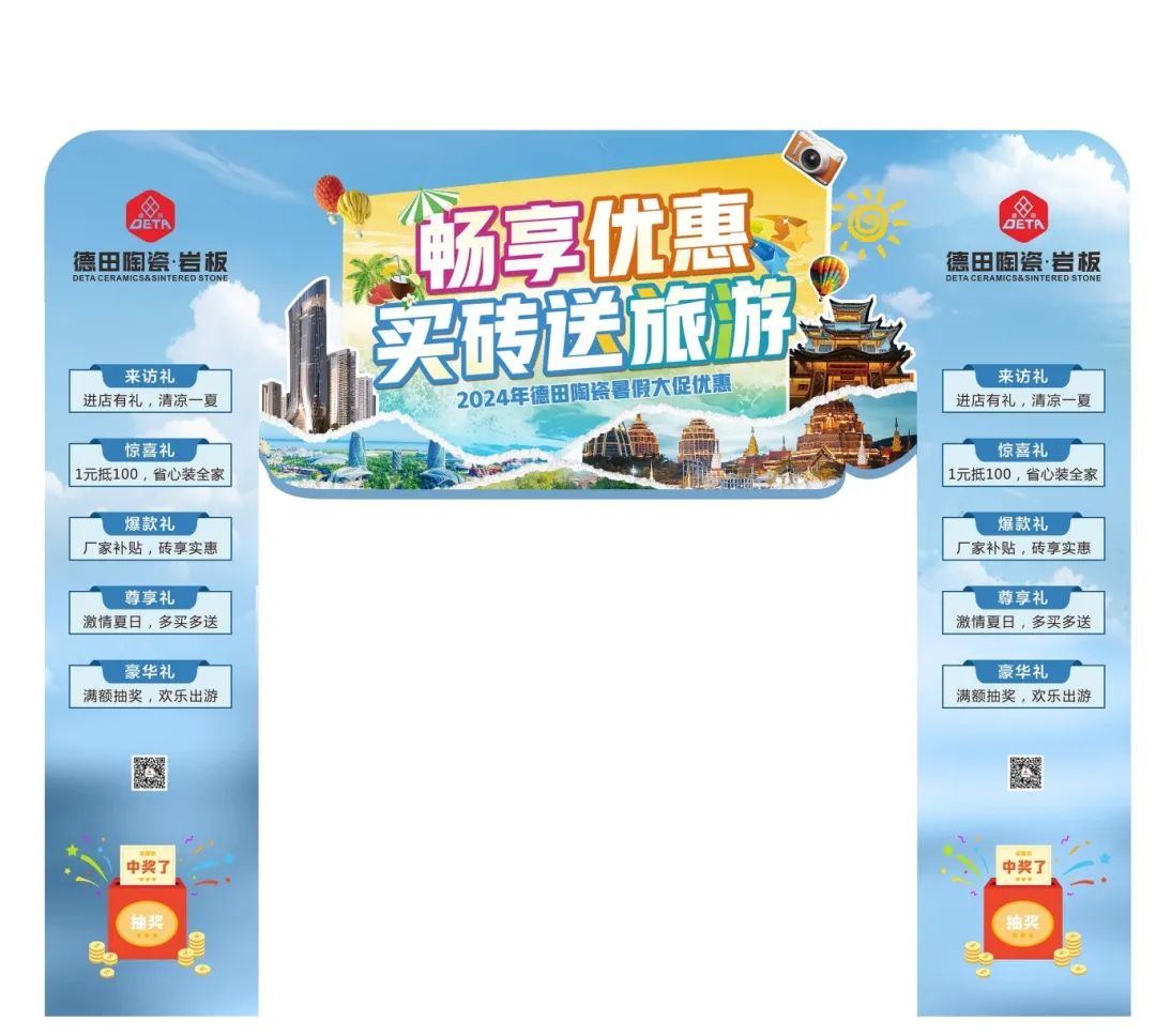 為了迎接暑期銷售旺季節點,更好地配合廣大經銷商家人們開展促銷活動,營造濃郁的促銷氛圍,搶占市場,德田陶瓷發起“暢享優惠,買磚送旅游”暑期促銷活動,并推出系列促銷方案及物料,含拱門、單張、展架、貼紙等整套源文件。